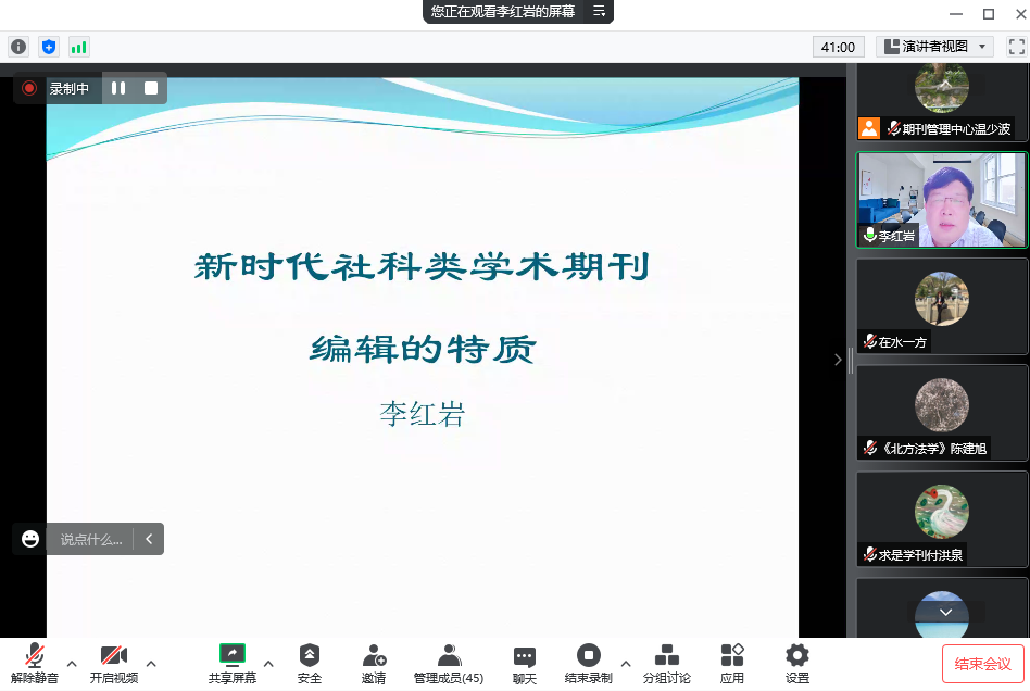 副校长于文秀、社会科学处负责人、科学技术处相关工作负责人、期刊管理中心人员,我校“十刊一报”期刊编辑部负责人和全体成员参加了本次线上讲座。社科处副处长兼校学术委员会副秘书长朱志勇主持本次讲座。